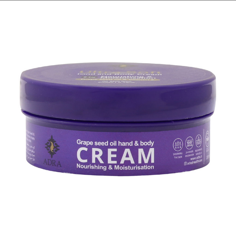 کرم صورت و بدن حاوی روغن هسته انگور آدرا رطوبت مورد نیاز پوست را تامین می کند. این کرم مرطوب کننده با بهره مندی از خواص بی نظیر روغن هسته انگور به همراه ویتامین E و ویتامین A و همچنین امگا ۶ منبع غنی از ترکیبات محافظت کننده و مغذی برای پوست شما می باشد. خواص آنتی اکسیدانی و کلاژن سازی انگور در این کرم بدن از ویژگی های آن به شمار می رود.