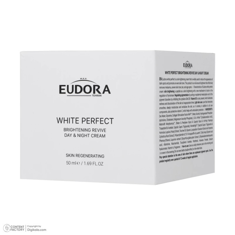 کرم ضد لک برایتنینگ ریوایو وایت پرفکت ادورا مکس 50 میلی لیتر Eudora Max White Perfect Brightening Revive Day And Night Cream 50ml؛ حاوی عصارهها و روغن گیاهی و مواد اثربخشی میباشد که یک فرآوردهی روشنکننده و شفافکنندهی پوست است و به دلیل وجود ترکیبات White .0.0 و Wonderlight، مهارکنندهی آنزیم تیروزیناز است که به طور گسترده برای کاهش ظاهر لکههای تیره و ایجاد یکنواختی رنگ پوست استفاده میشود و مناسب انواع پوست میباشد.