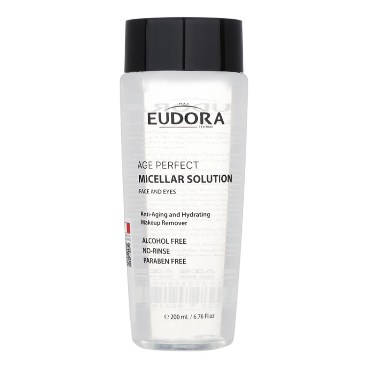 محلول پاک کننده آرایش میسلار سولوشن ایج پرفکت ادورا مکس 200 میلی لیتر Eudora Max Age Perfect Micellar Solution 200ml؛ حاوی ترکیبات شویندهی ملایم و بدون مواد صابونی، الکل و پارابن میباشد که به پاکسازی پوست صورت و چشمها از مواد آرایشی، چربی اضافی و آلودگیهای روزانه میپردازد و حساسیتزا نیست و مناسب انواع پوست است. محلول پاک کننده آرایش میسلار سولوشن ادورا مکس، همچنین حاوی اسید هیالورونیک، ویتامین سی C لیپوزومال، بیوتین و عصارهی گیاهی رازک (هومولوس لوپولوس) میباشد که باعث آبرسانی و حفظ رطوبت شده و ضد پیری پوست است و پس از استفاده دیگر نیازی به آبکشی نخواهد بود.